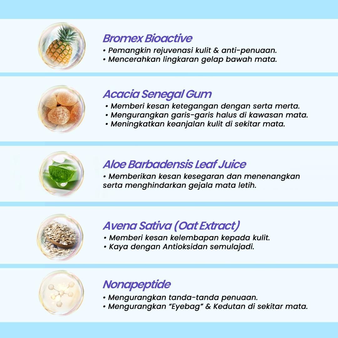 * Membantu kesihatan kawasan mata, anti-oksida dan pencerahan kulit